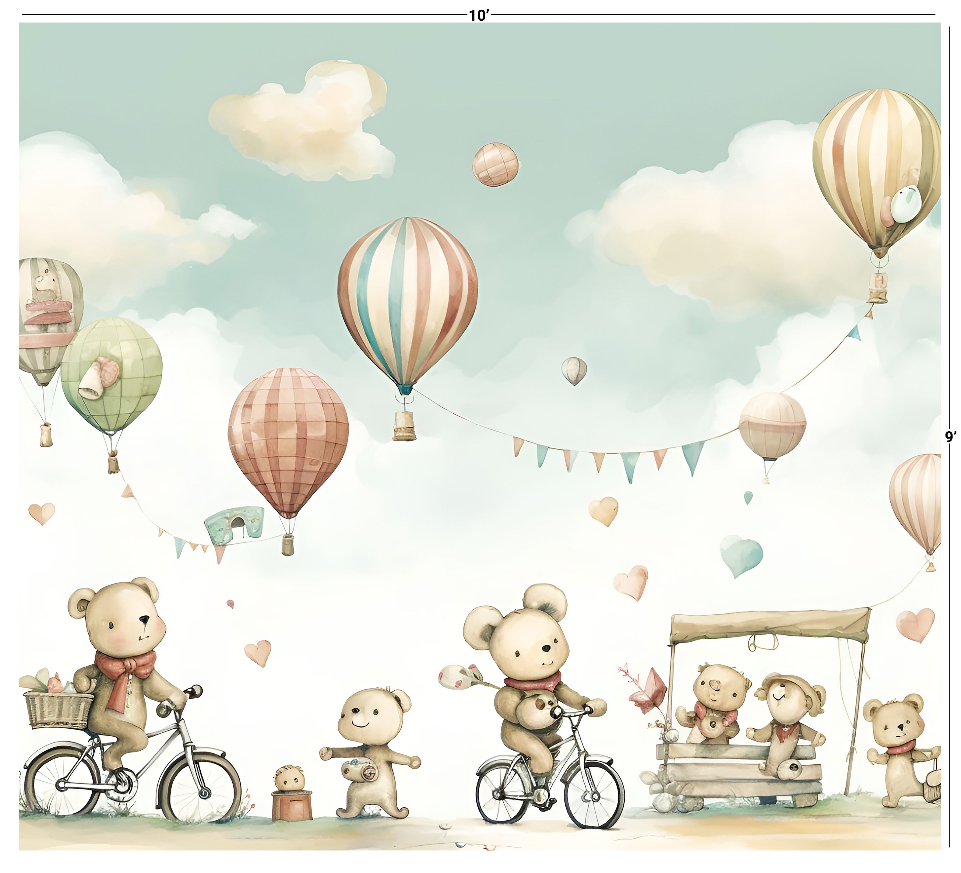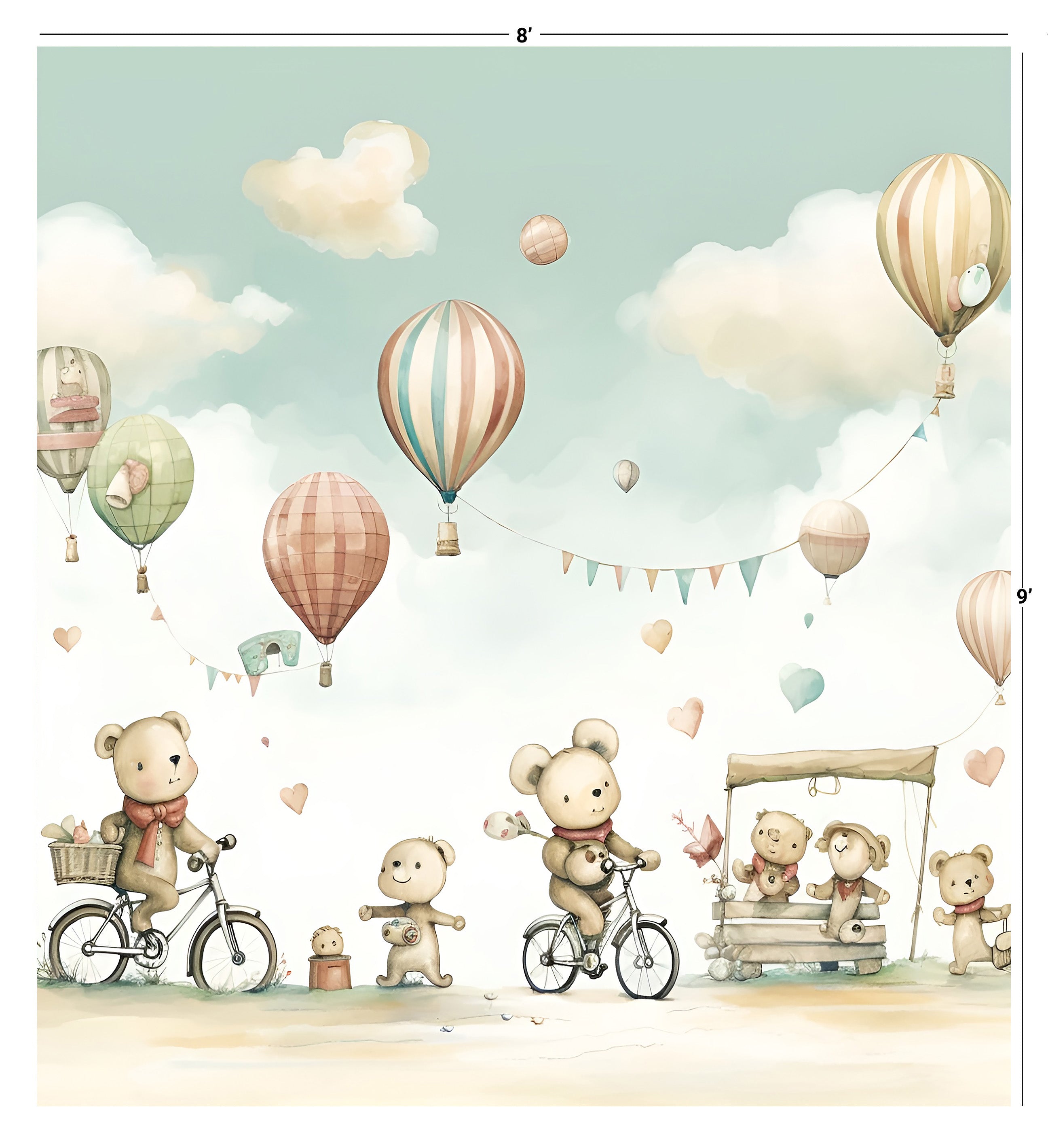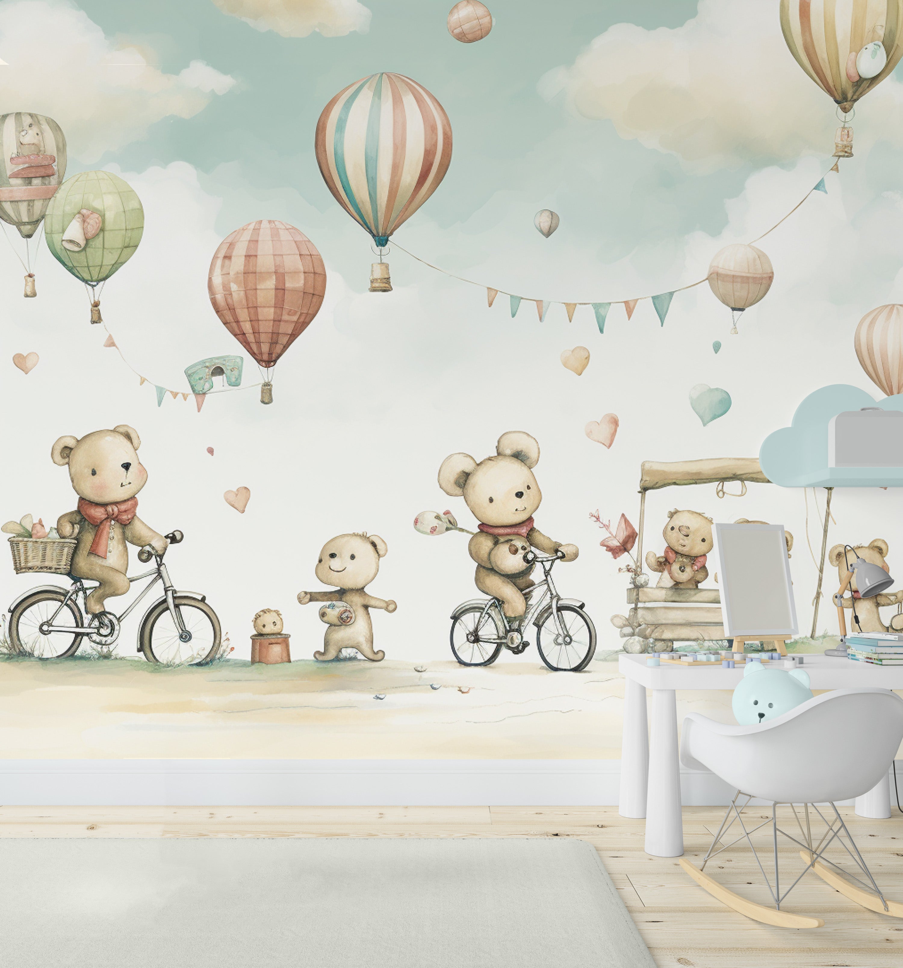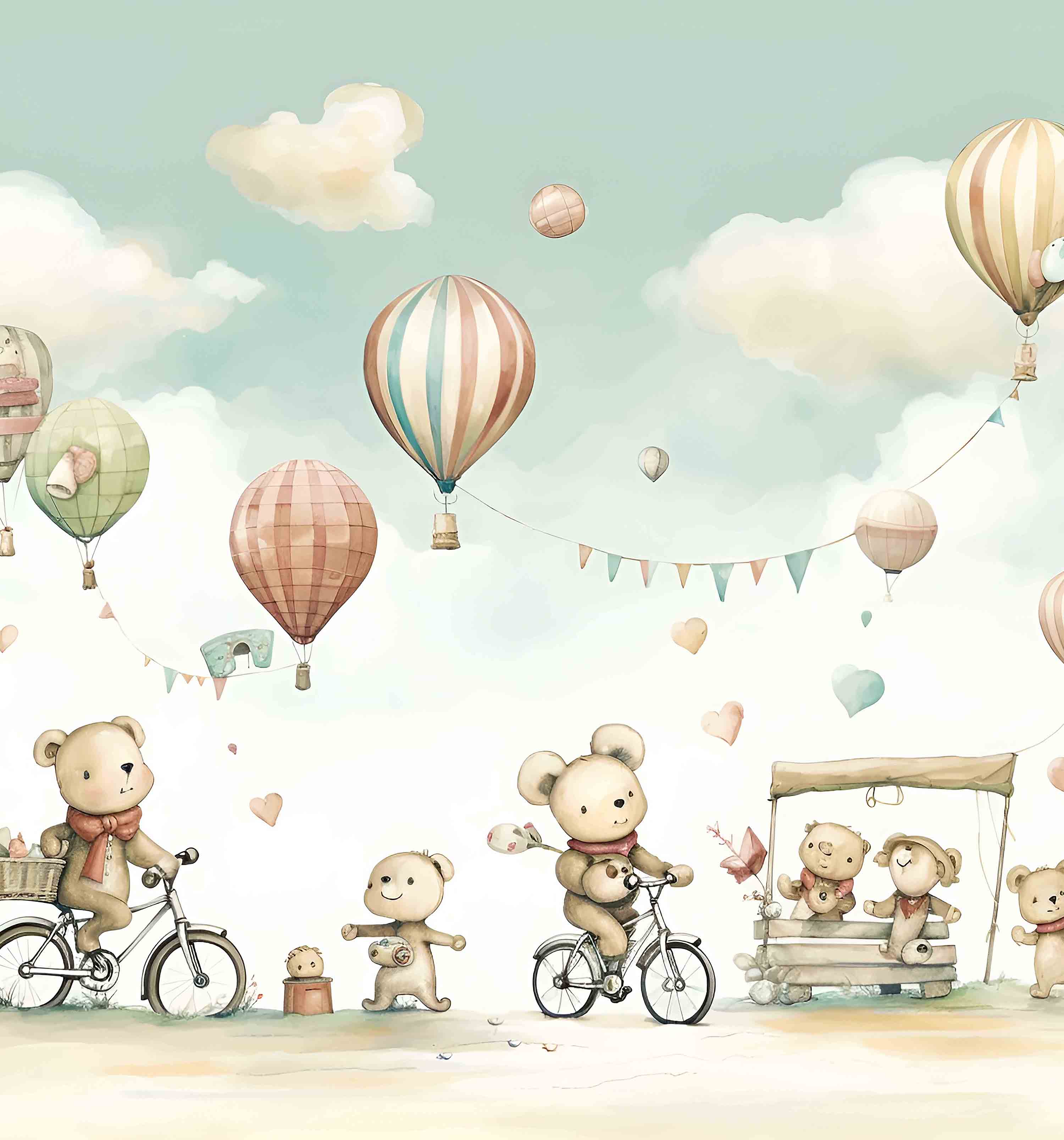 Introducing KD 0014, a sophisticated wallpaper for your child's room. Featuring a calming and neutral color scheme with playful teddy bears on a cycle, charming hot air balloons, and elegant triangular streamers in the sky. Elevate your child's space with this artistic wallpaper.