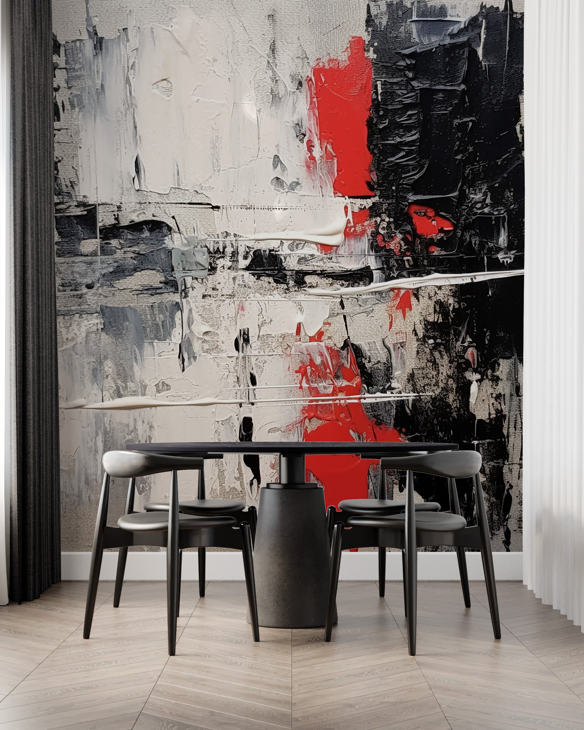 Discover the bold and sophisticated beauty of our Acrylic on Canvas Collection, featuring abstract designs in black, white, and grey with striking red accents. These wallpapers bring a modern, artistic flair to any space, blending minimalist elegance with dynamic color contrasts. Perfect for creating a contemporary and stylish atmosphere, each mural offers a unique visual impact.