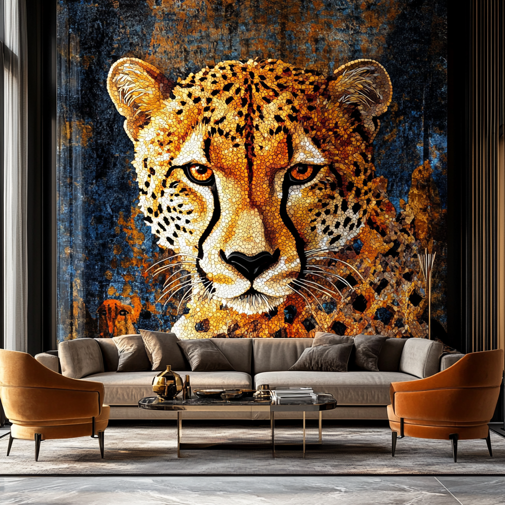 A regal cheetah with a mosaic-inspired texture, evoking power, precision, and mystery.