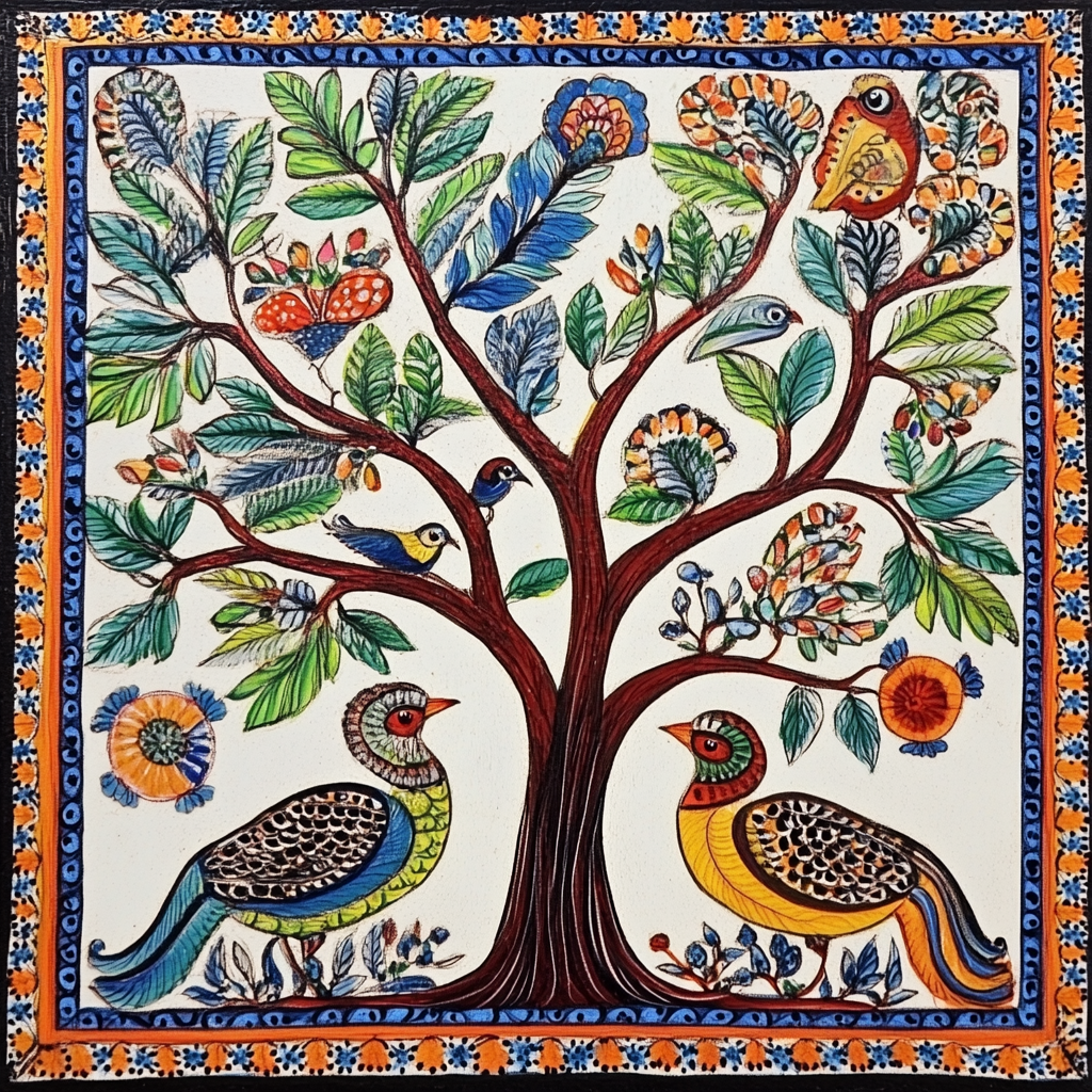 This artistic wallpaper captures a tree filled with vibrant birds nestled among intricate branches and leaves. The lively colors—greens, blues, and oranges—combined with the playful patterns of the birds bring a sense of joy and energy. The white background enhances the vivid details, while the colorful border ties the composition together. This design is perfect for bringing an element of nature and serenity into living rooms or creative spaces.