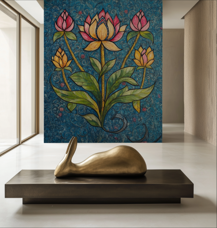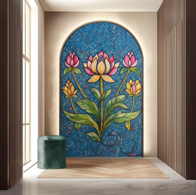 This serene and elegant Madhubani-inspired mural features a blooming lotus surrounded by buds and lush green leaves. The vibrant pink and yellow tones of the flowers contrast beautifully with the deep blue background, evoking a sense of calmness and harmony. The golden border with floral details adds a regal touch to the design. Perfect for spaces aiming for tranquility and cultural sophistication, such as meditation rooms, bedrooms, or yoga studios.