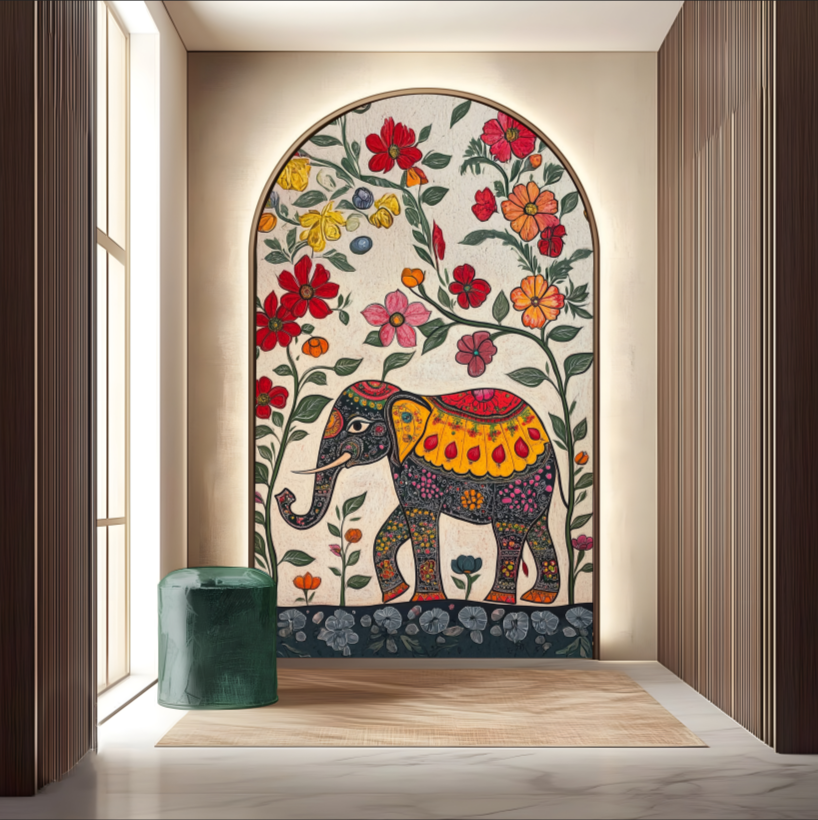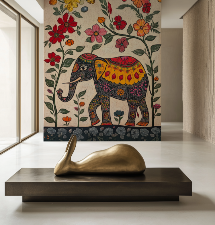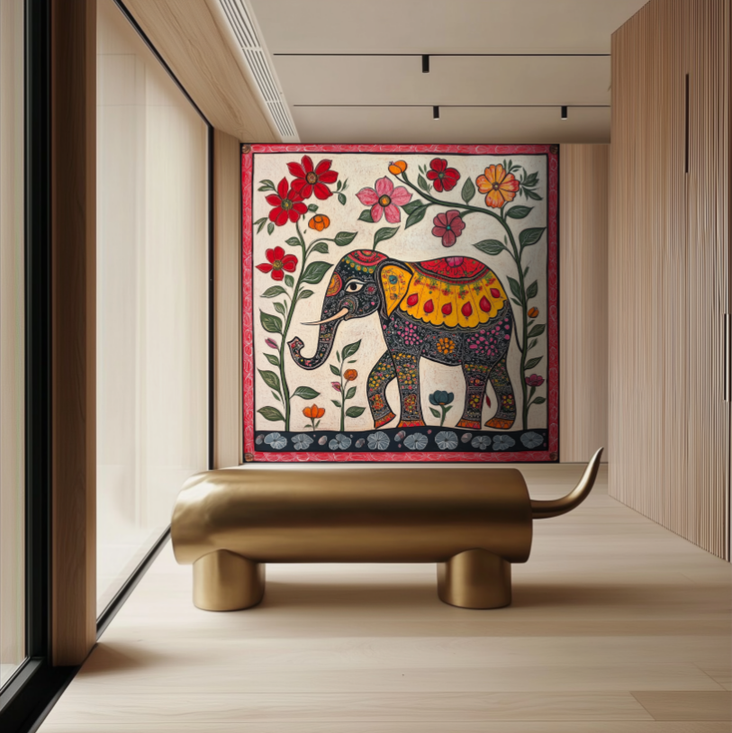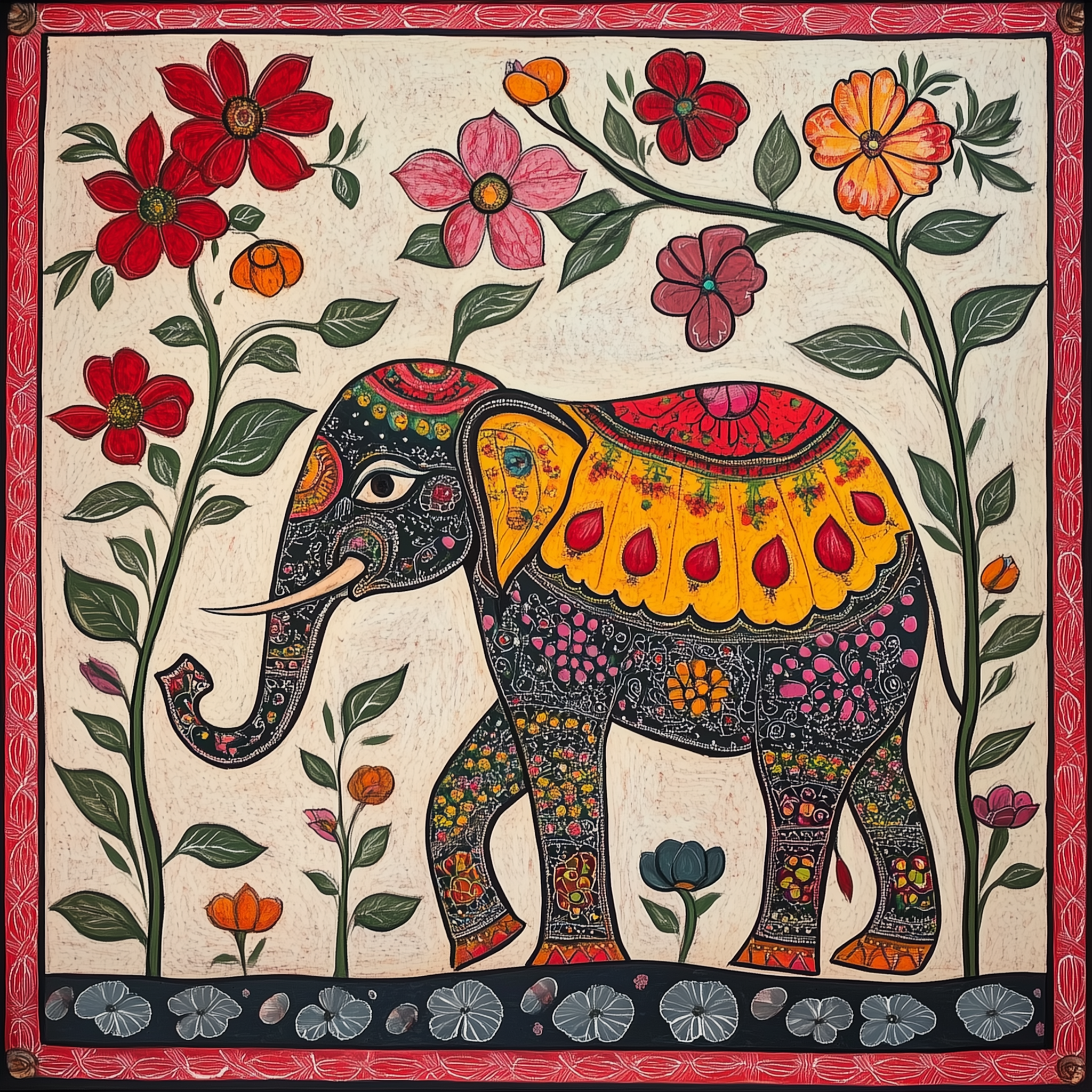 A majestic elephant, Gaj Gatha (गज गाथा) signifies strength, wisdom, and auspicious beginnings. The detailed patterns and vivid hues pay homage to royal processions and grand traditions.