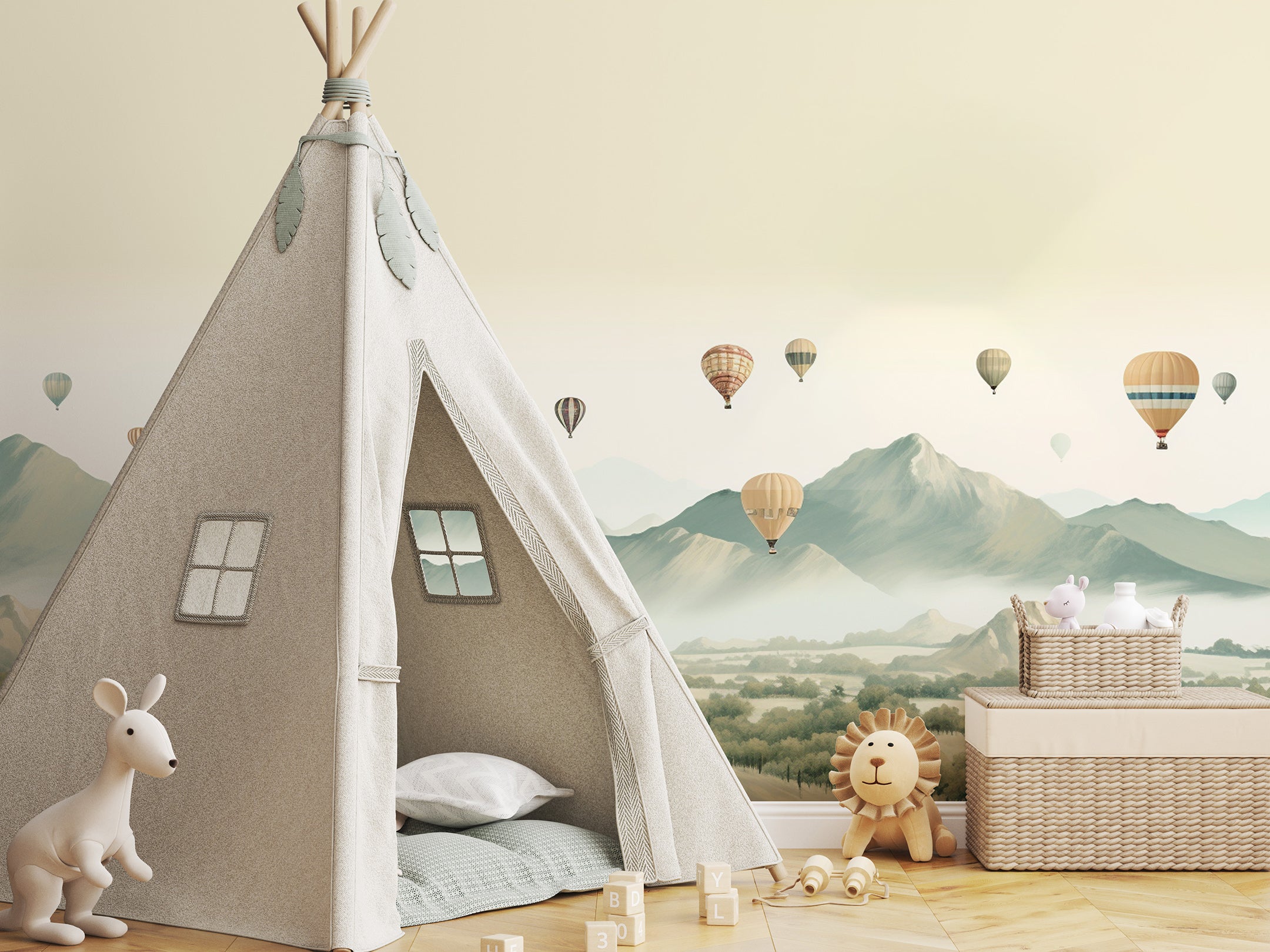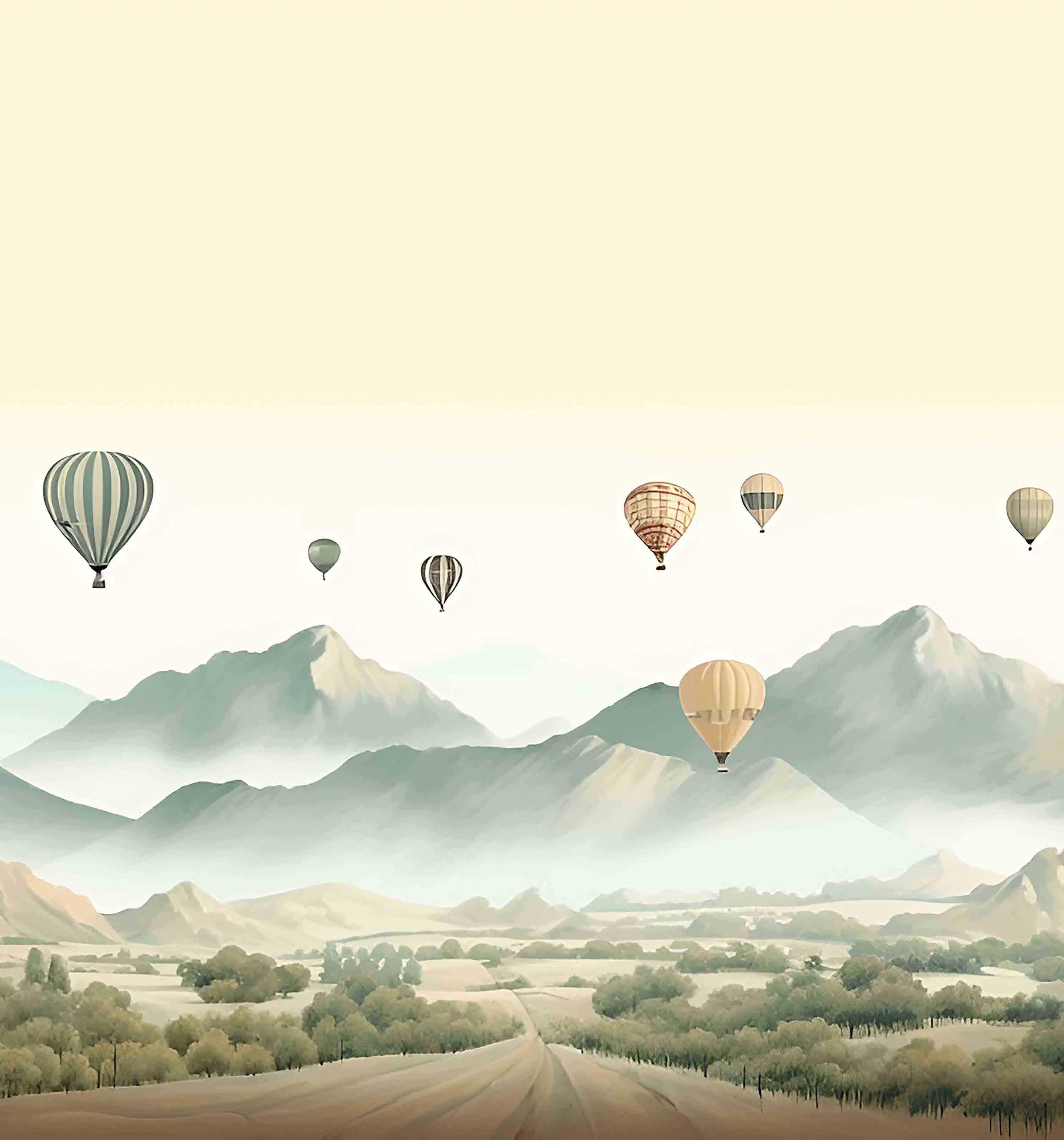 Transform your child's room with KD 0015, a stunning landscape wallpaper featuring subtle blueish mountains and a touch of desert. Let their imagination soar with hot air balloons in the horizon. Elevate their space with this exclusive, sophisticated design.