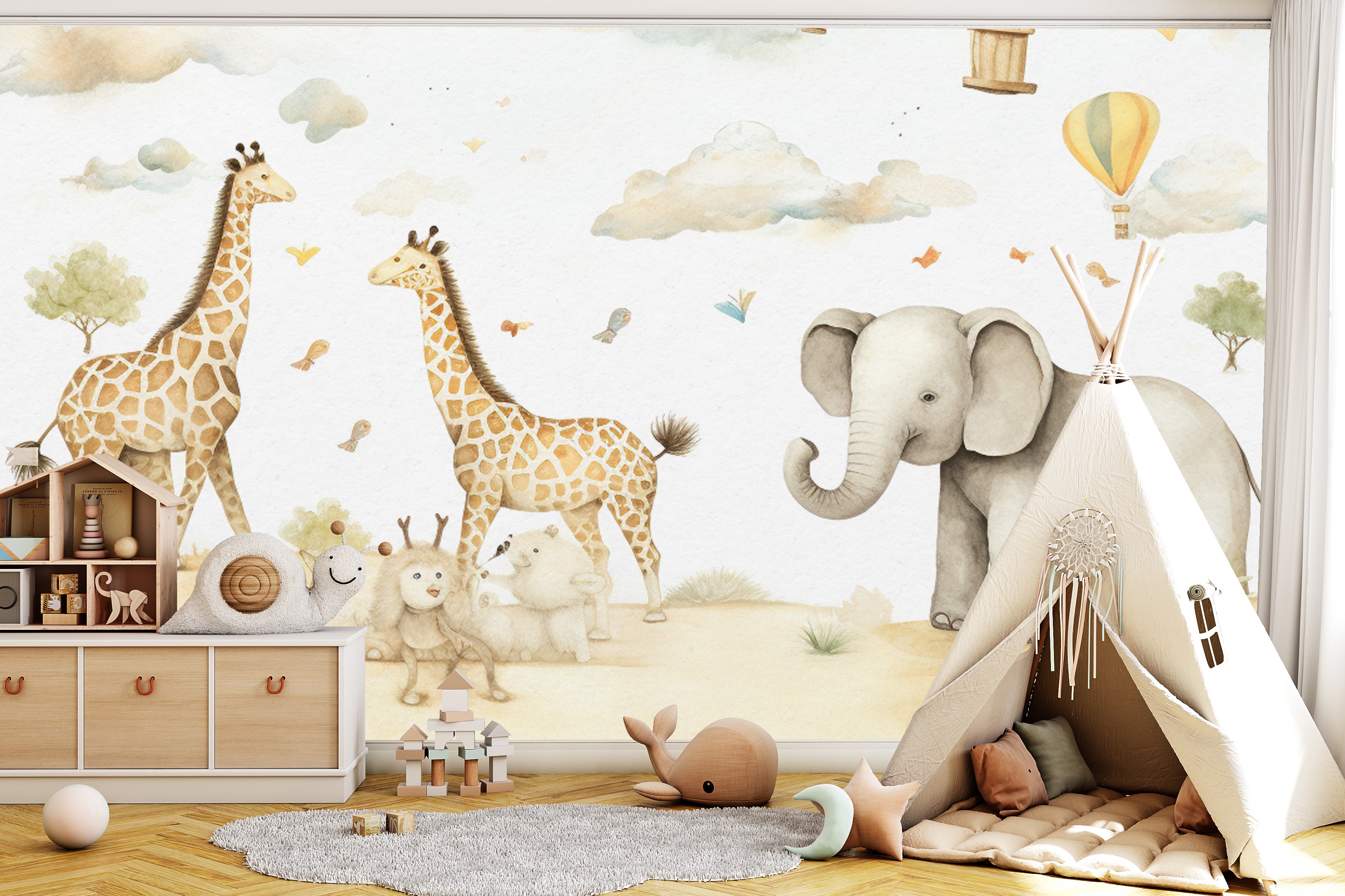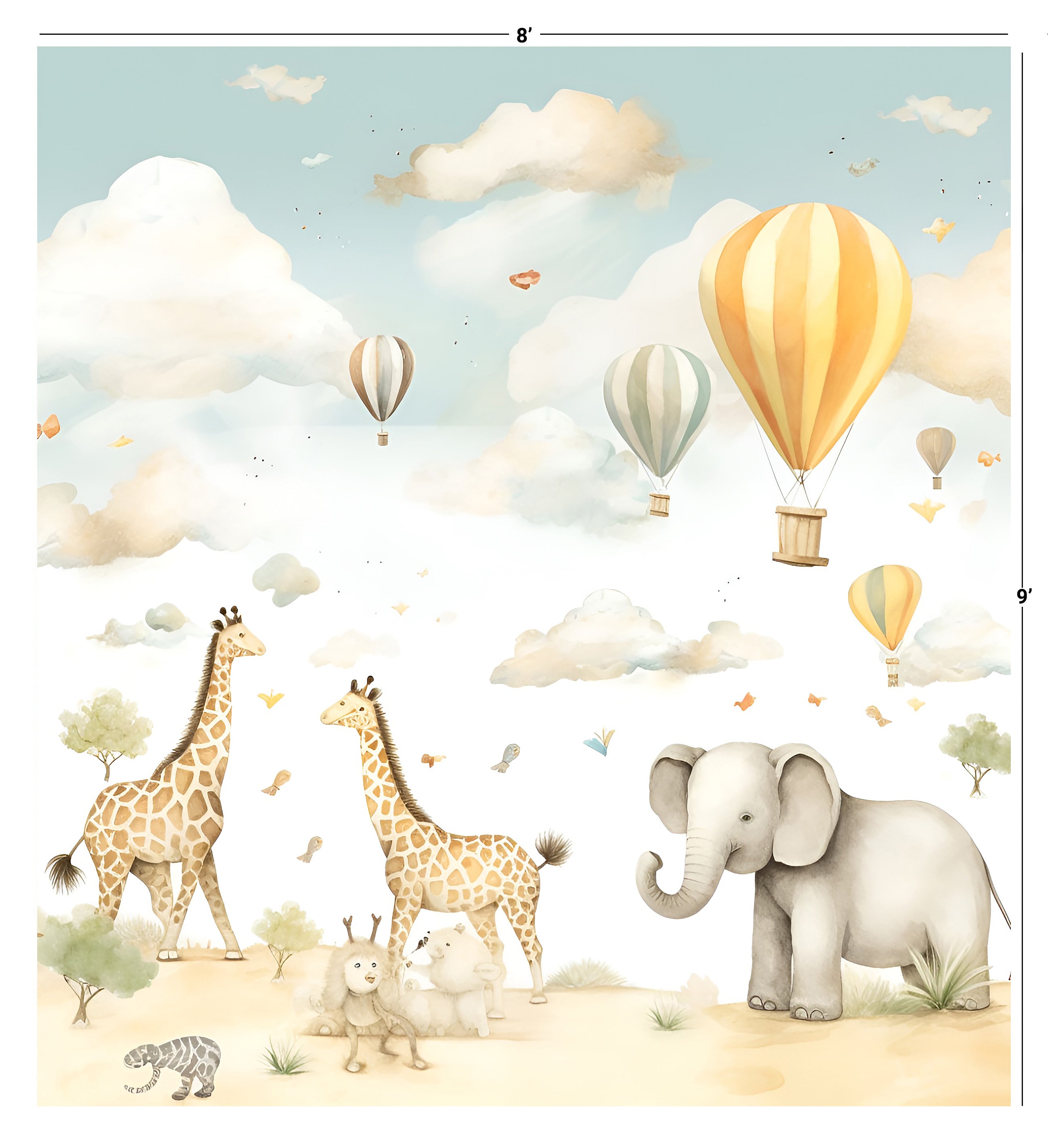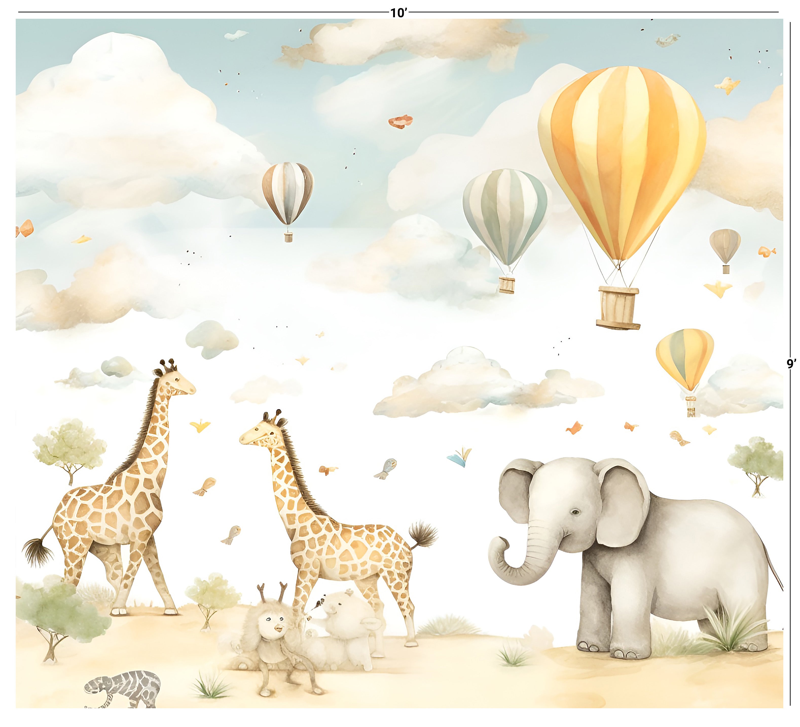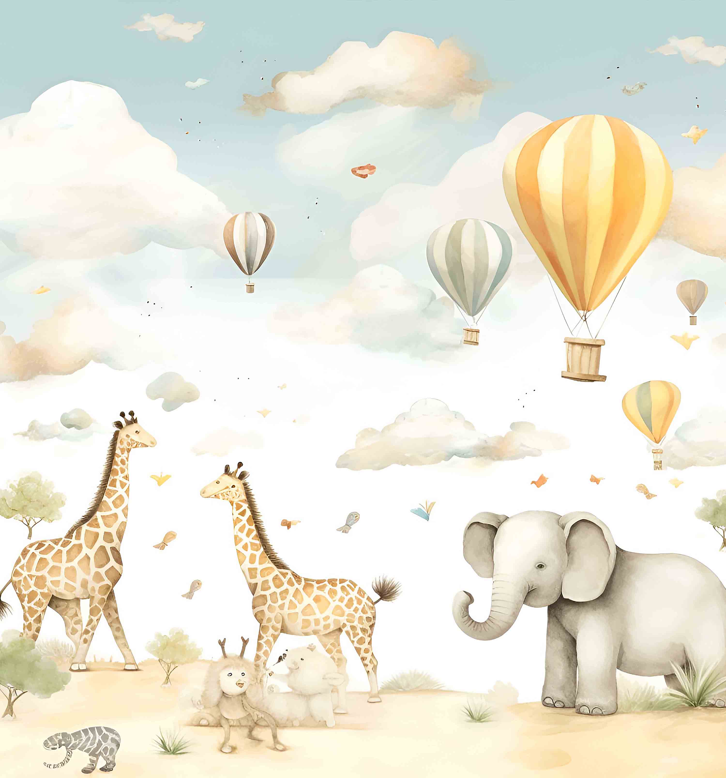 Introducing KD 0020 - a dreamy wallpaper for your child's room, featuring whimsical giraffes and elephants soaring through pastel-colored skies in hot air balloons. Elevate their imagination with this exclusive and sophisticated design. Transform their room into a work of art.
