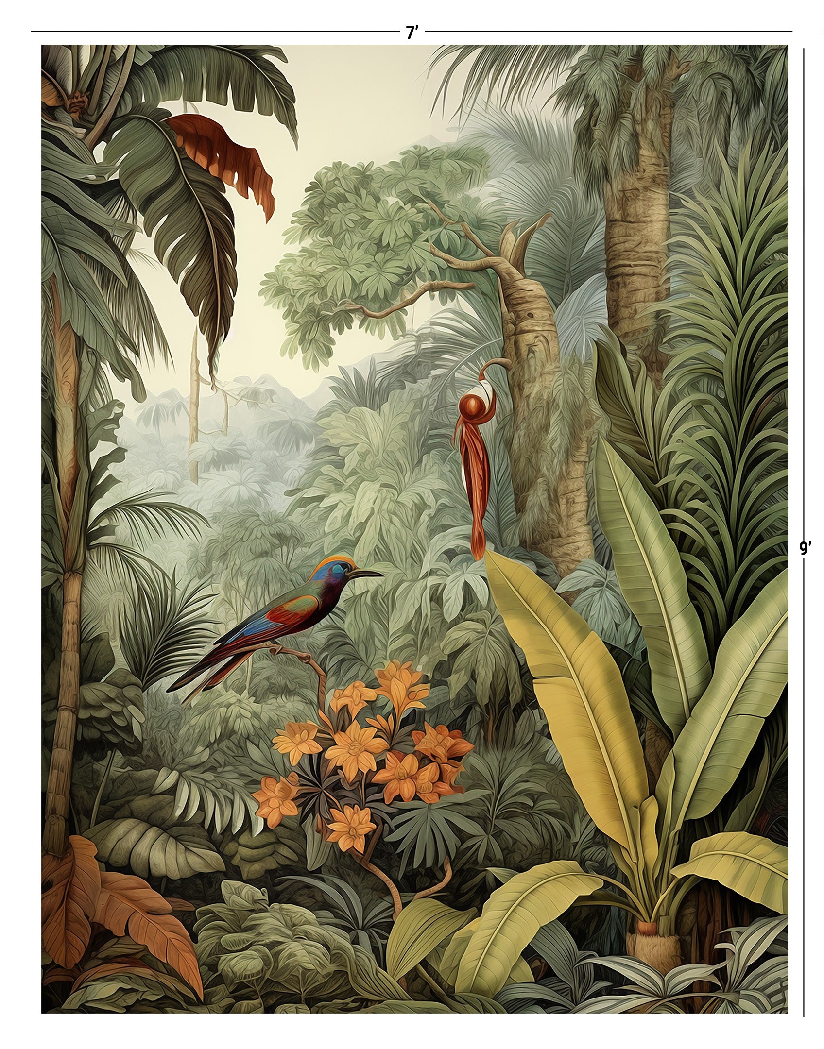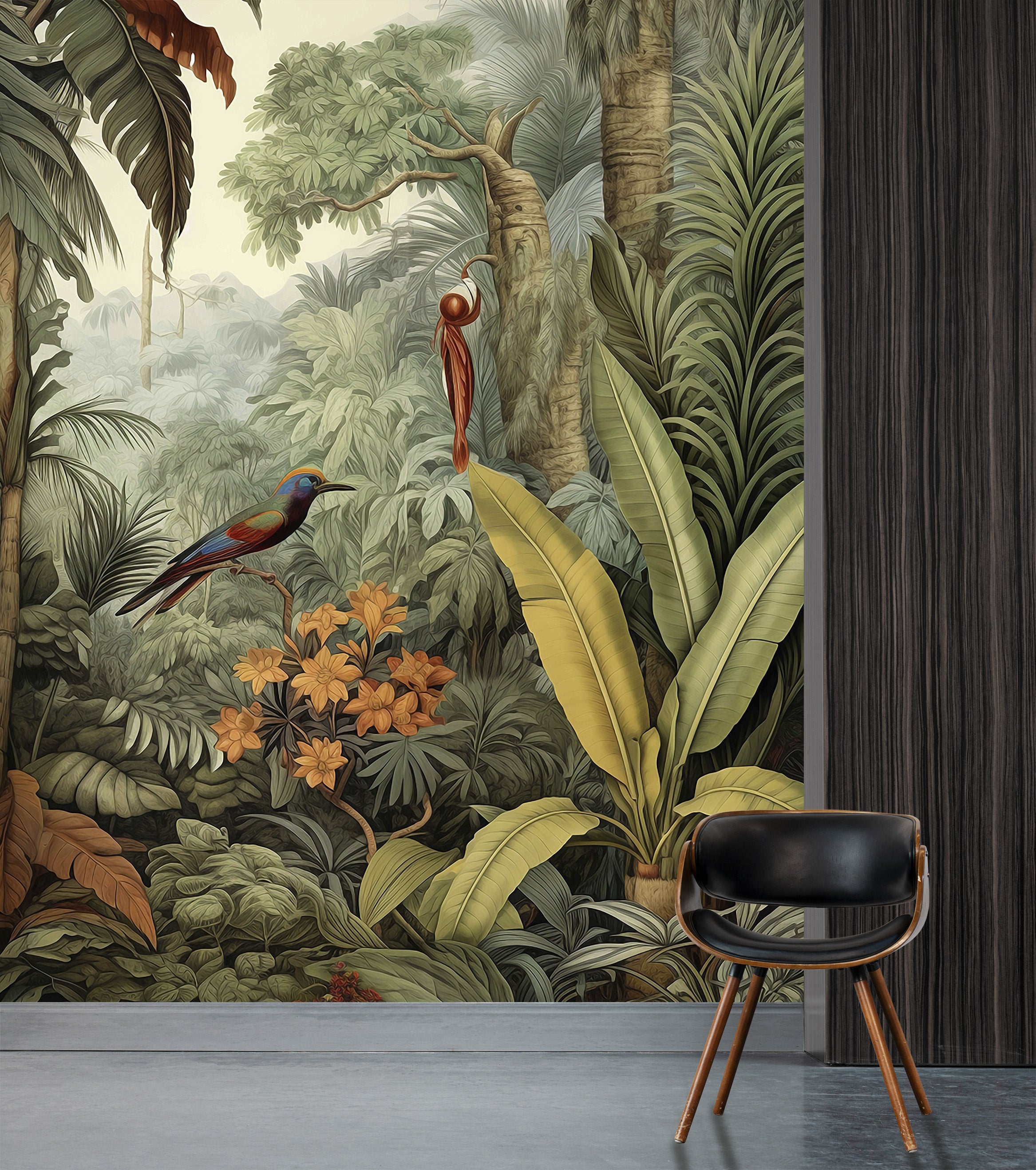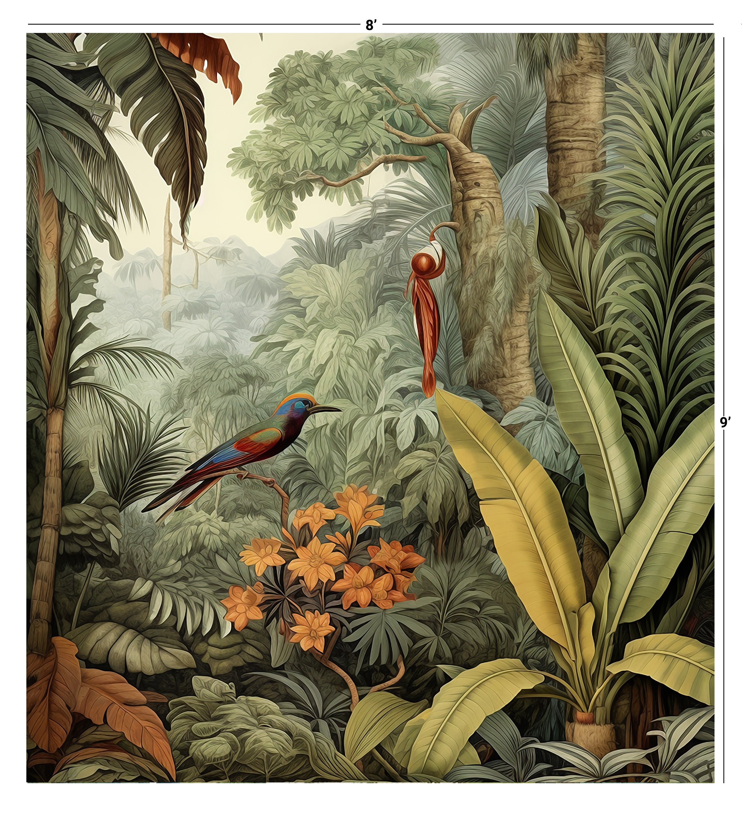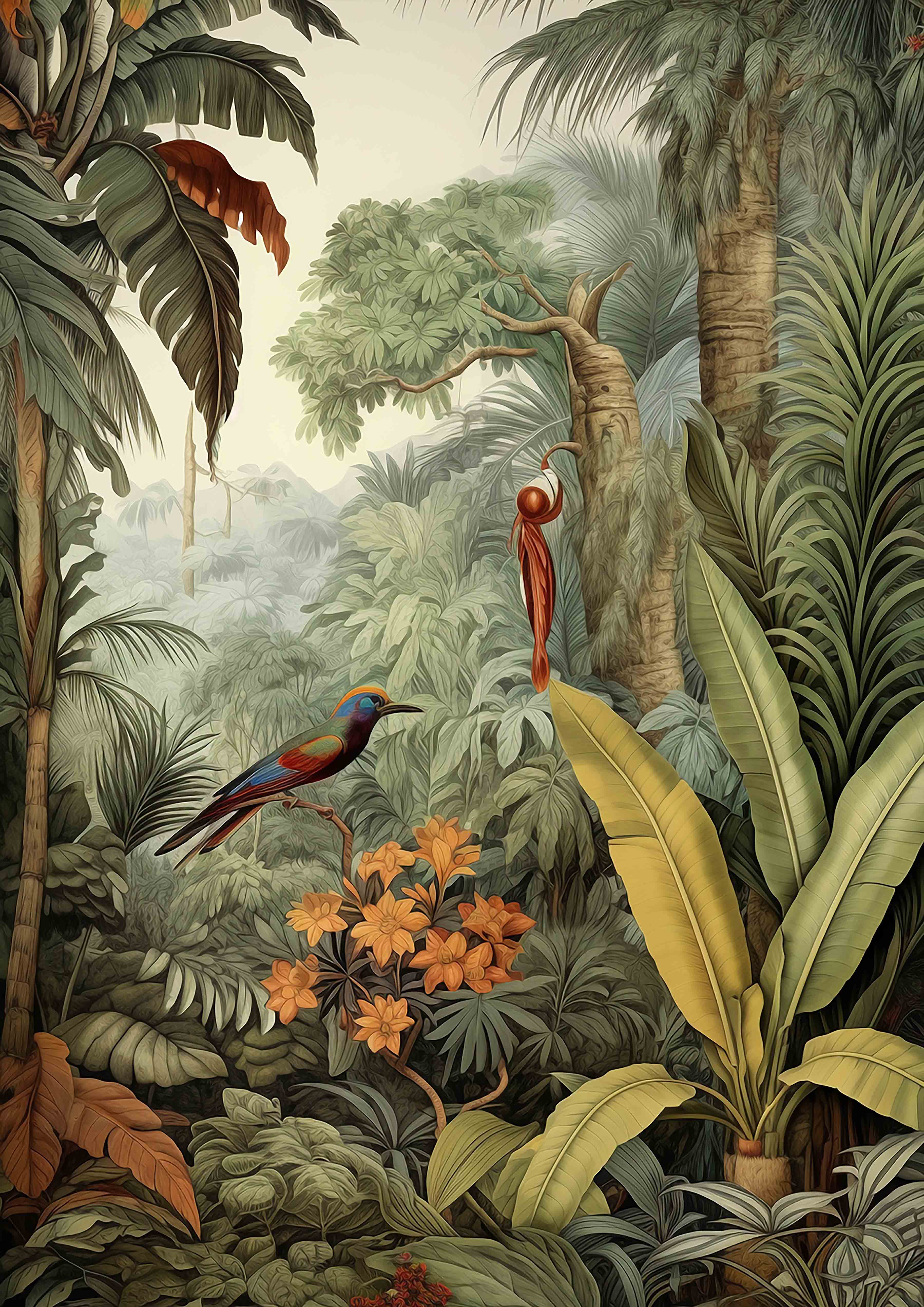 Immerse yourself in the breathtaking allure of our Tropical Oasis Collection. This series showcases vibrant scenes of dense tropical forests, where towering palm trees and cascading waterfalls create a paradise of greenery and life. Birds in flight add a touch of dynamism and grace, making each mural a window into a serene, untouched world.
