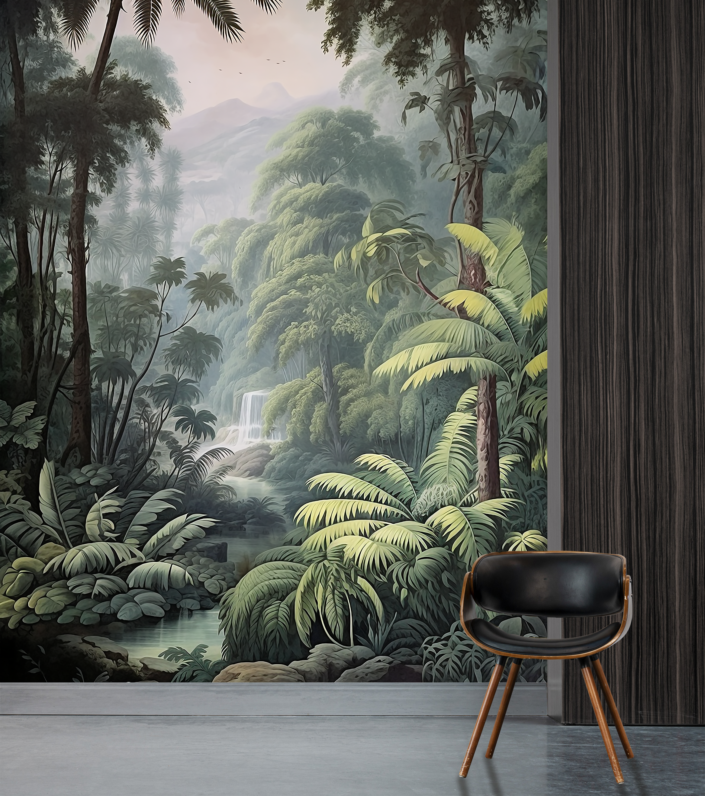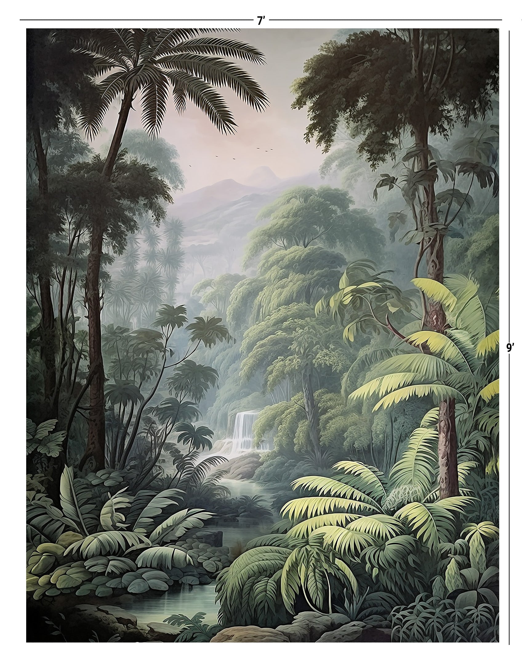 Immerse yourself in the breathtaking allure of our Tropical Oasis Collection. This series showcases vibrant scenes of dense tropical forests, where towering palm trees and cascading waterfalls create a paradise of greenery and life. Birds in flight add a touch of dynamism and grace, making each mural a window into a serene, untouched world.
