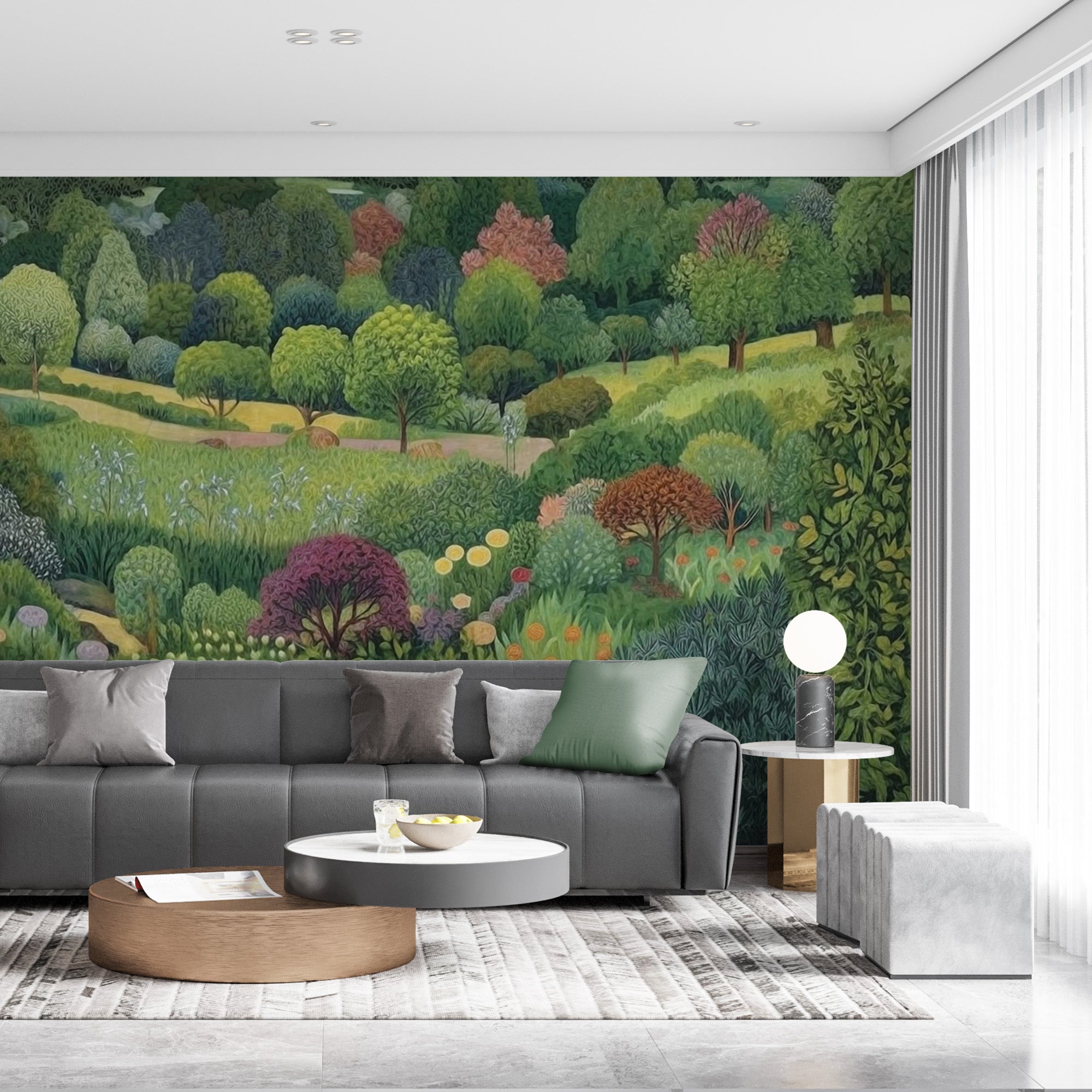 Our Verdant Sanctuary Collection is a tribute to the lush, layered beauty of forested landscapes. Featuring an array of rich, green foliage and delicate flowers, these murals evoke a sense of calm and rejuvenation. The detailed depiction of varied plant life, from towering trees to blooming undergrowth, creates an immersive experience that brings the serenity of nature into your home.