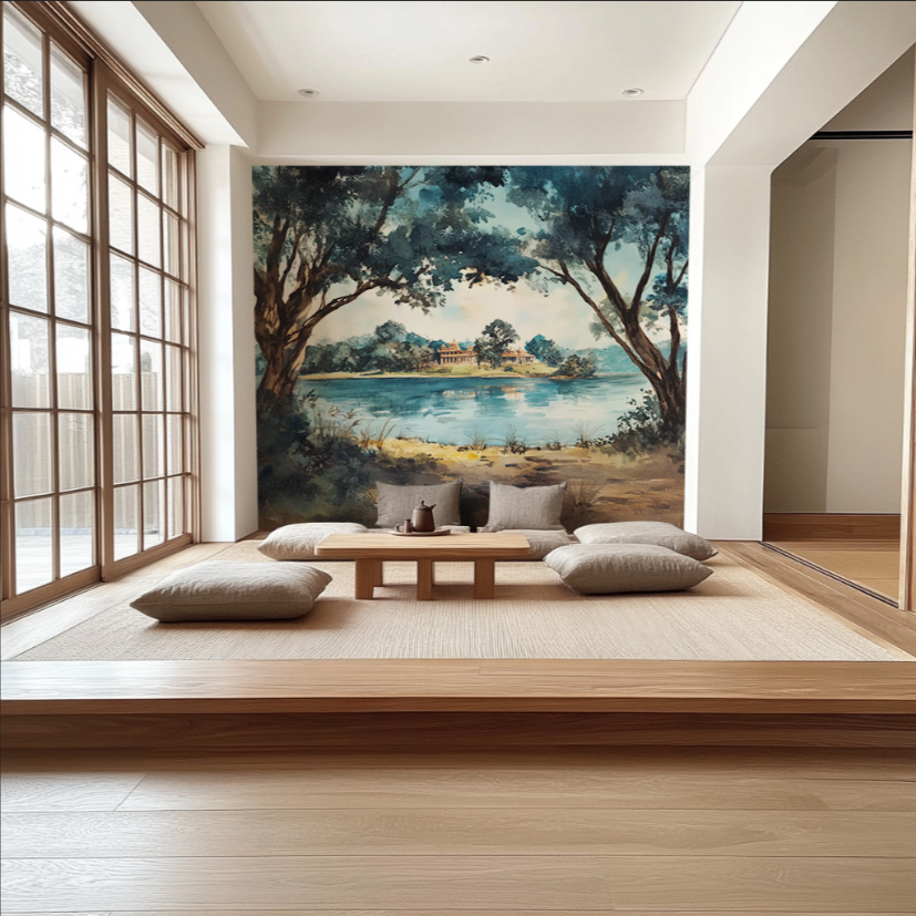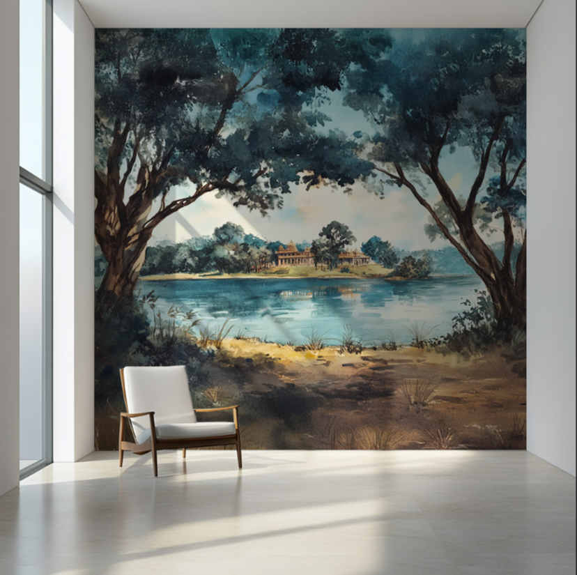 Inspired by traditional Indian landscapes, this artwork highlights the timeless beauty of a temple by a serene lake, framed by the rich foliage of banyan trees. Ideal for adding cultural charm to living spaces.